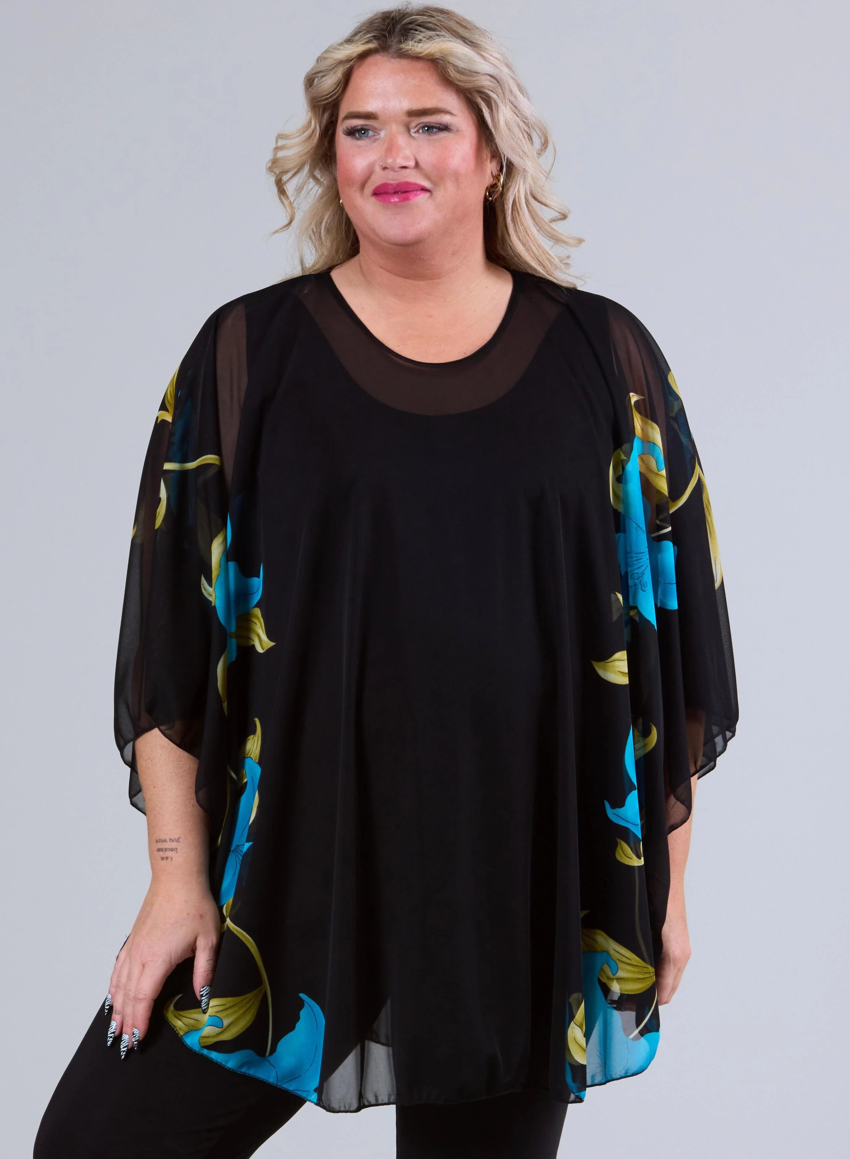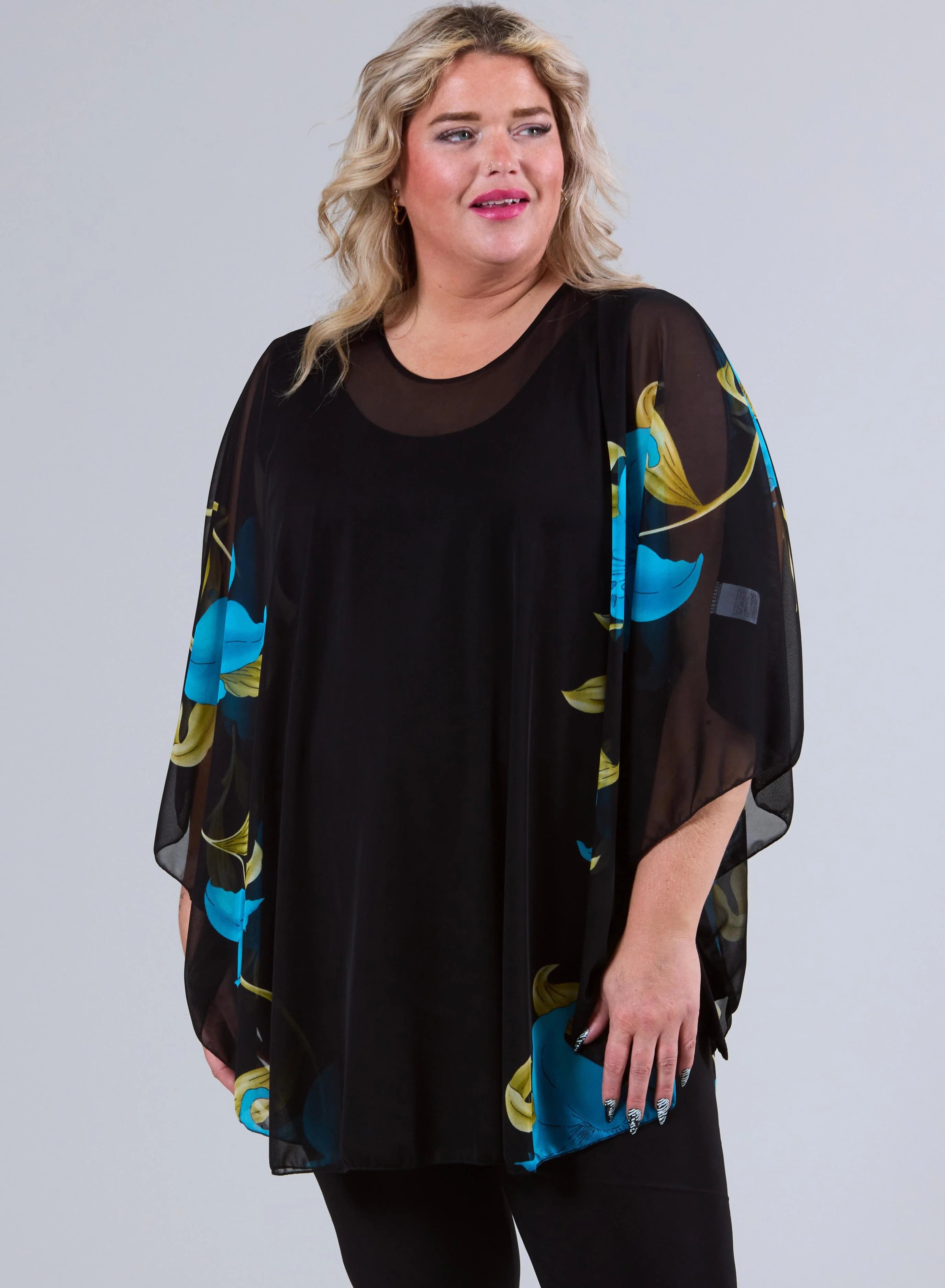Beschrijving: Deze luchtige poncho met sierlijke bloemenprint is een echte blikvanger. De soepele stof en zwierige pasvorm geven een elegante uitstraling die perfect is voor elke gelegenheid. Ideaal voor wie stijlvol en comfortabel voor de dag wil komen.