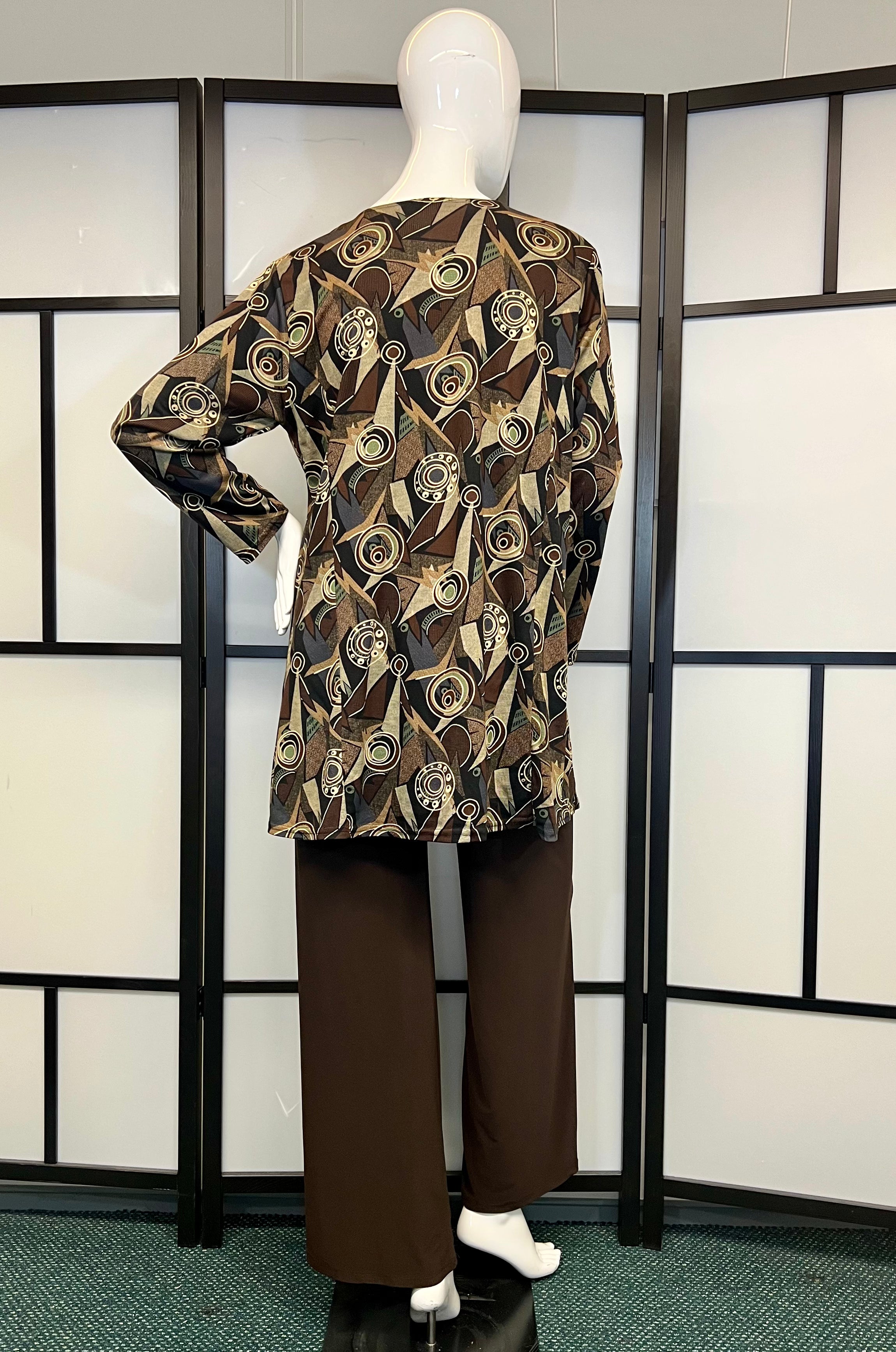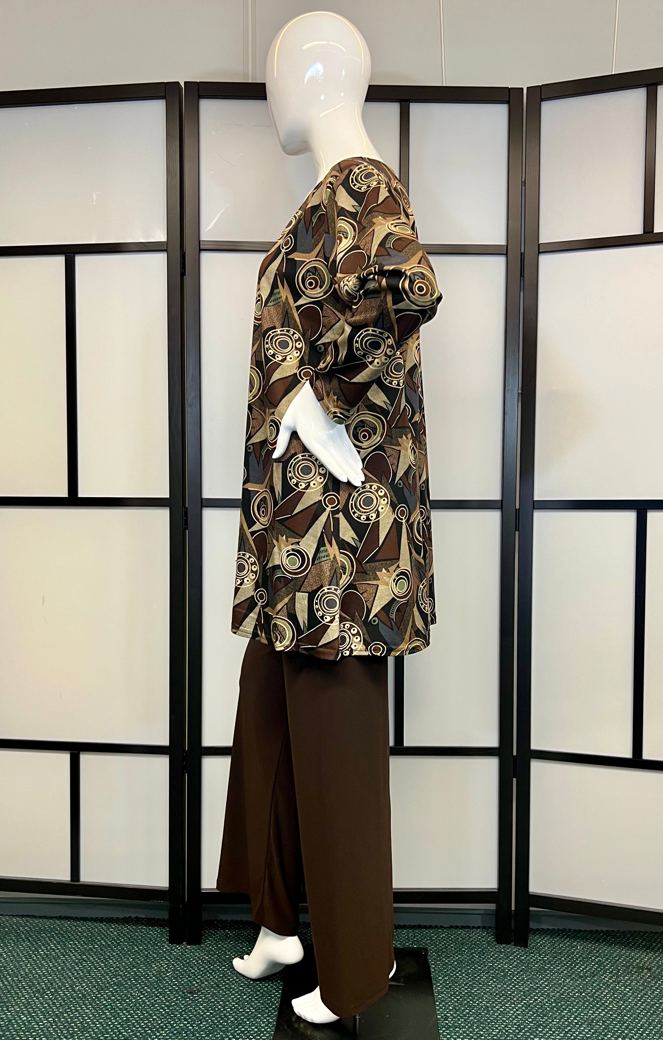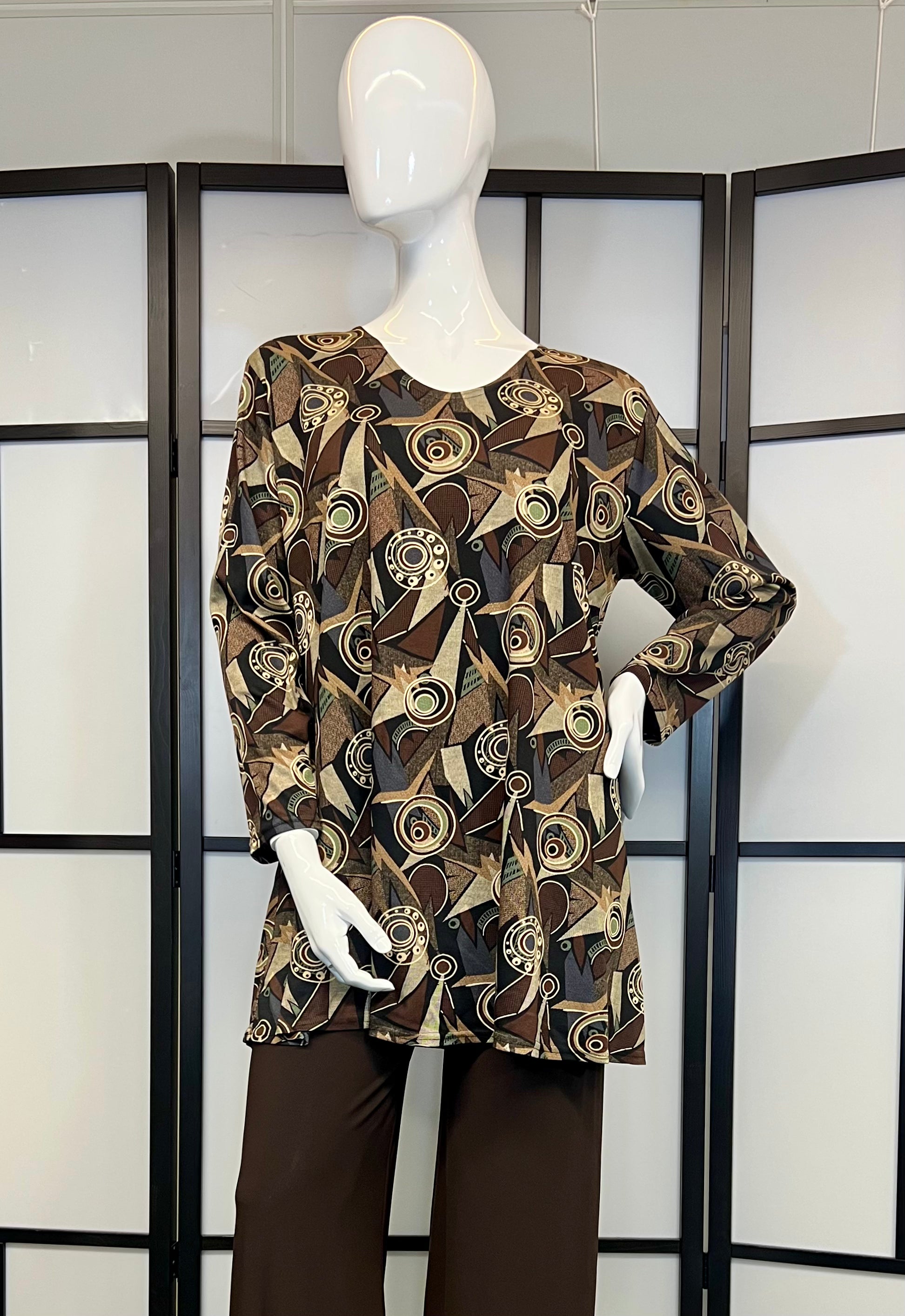 Beschrijving: Deze stijlvolle tuniek heeft een opvallende geometrische print in warme bruin-, beige- en groentinten. Het model heeft een rechte, losvallende pasvorm met lange mouwen en een ronde halslijn. Gemaakt van een soepele, comfortabele stof — perfect voor een modieuze en ontspannen look, zowel casual als gekleed.