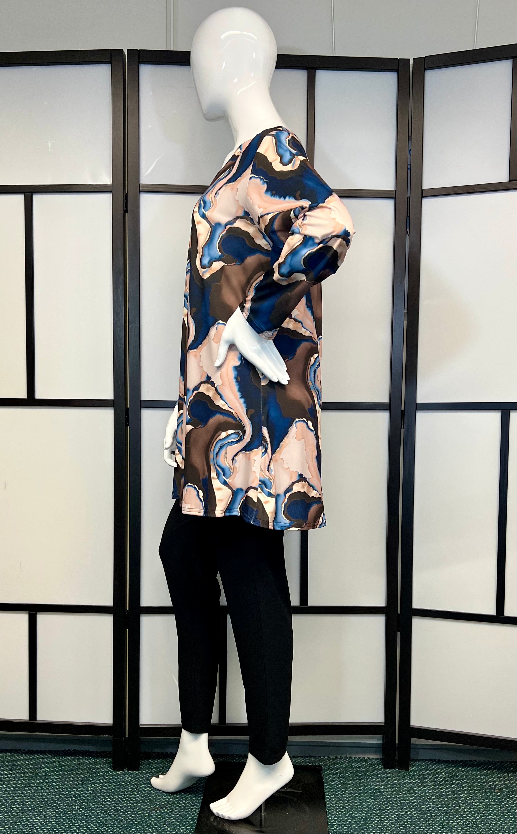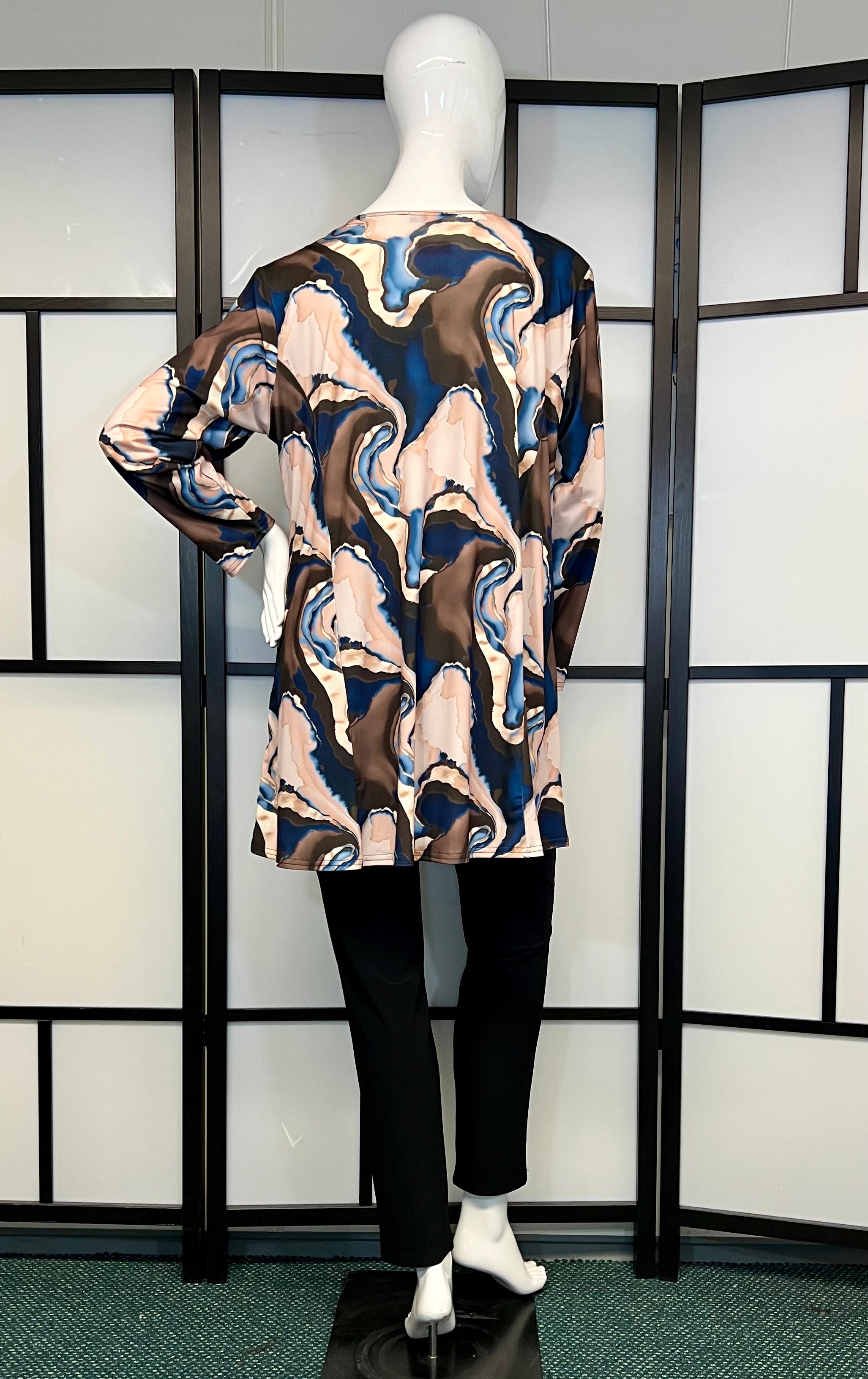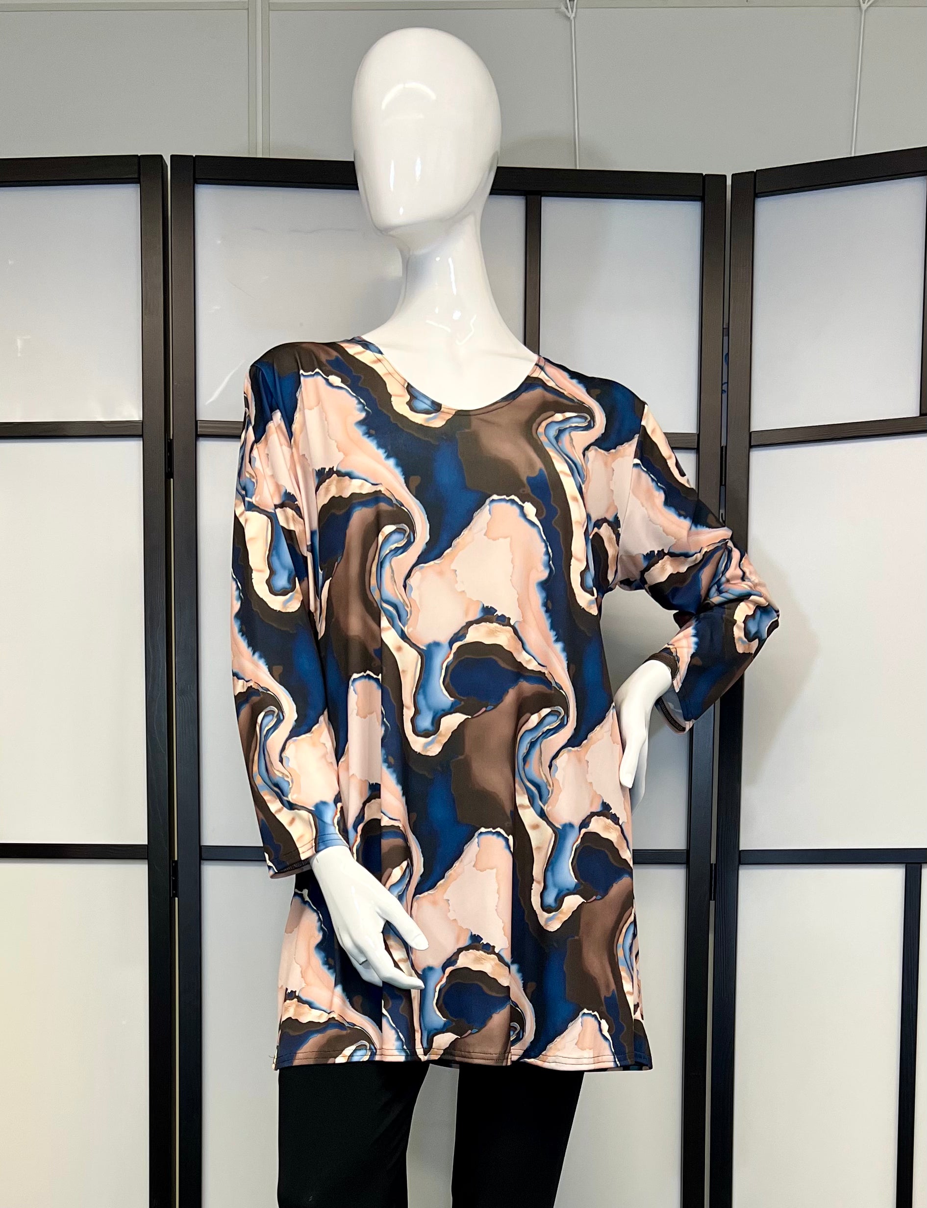 Beschrijving: Deze stijlvolle tuniek heeft een prachtig marmerpatroon in zachte tinten van roze, blauw en bruin, waardoor het een veelzijdig en elegant kledingstuk is. Het heeft een comfortabele pasvorm met lange mouwen, ideaal voor zowel casual als meer geklede gelegenheden. Perfect te combineren met leggings of een skinny jeans voor een moeiteloze look.
