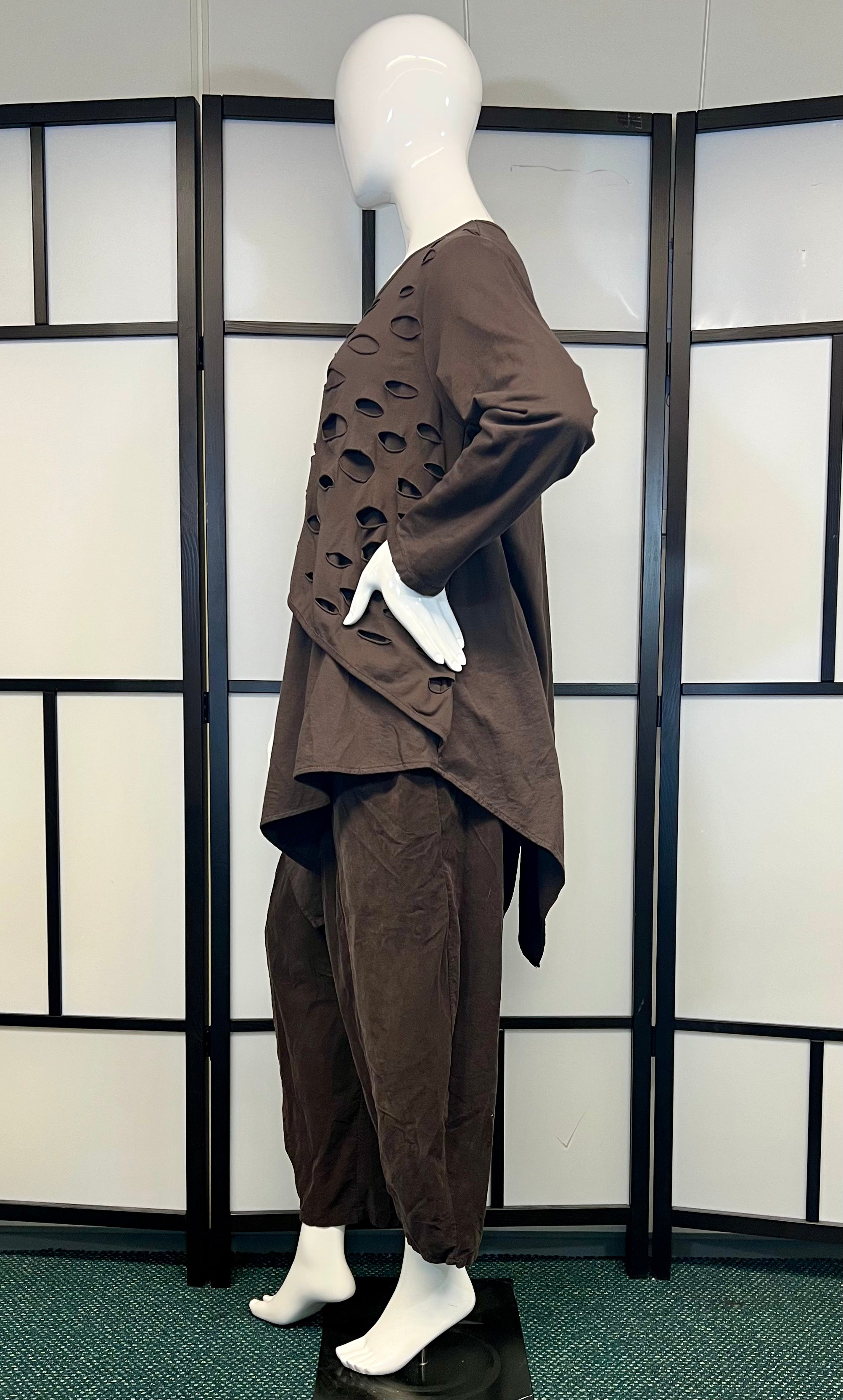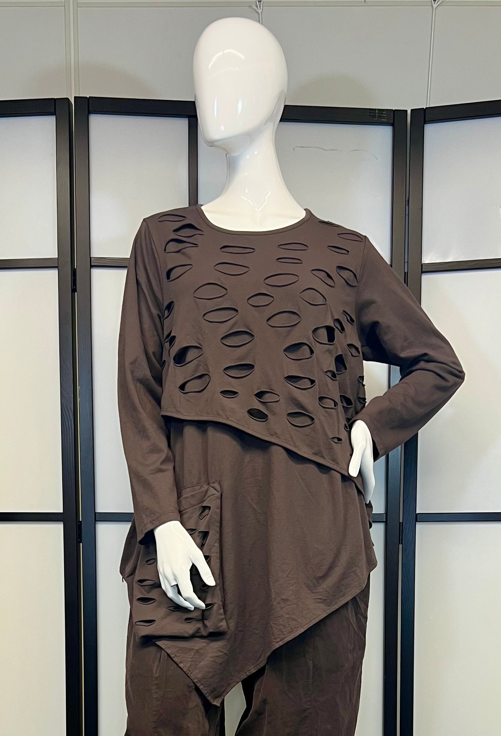 Beschrijving: Laat je van je creatieve kant zien met deze speelse en eigentijdse trui! De asymmetrische snit en de unieke uitsneden geven je outfit net dat beetje extra flair, zonder in te leveren op comfort. Ideaal voor wie houdt van een artistieke twist met een knipoog naar mode met lef.